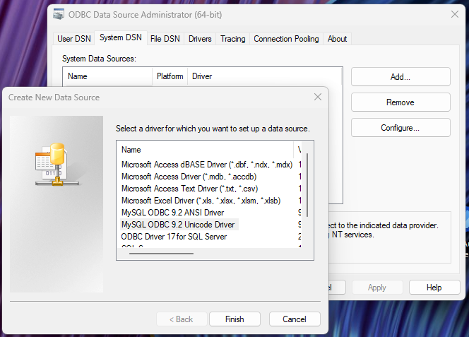 5. Wähle „MySQL ODBC 9.2 Unicode Driver“ und gib die Verbindungsdaten ein: