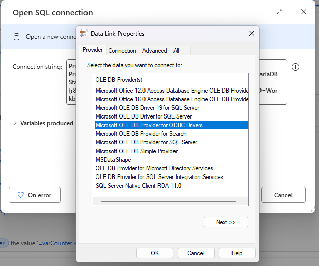 Wenn dir das Hantieren mit Connection Strings zu nervig ist oder du sicherstellen willst, dass wirklich alles korrekt gesetzt ist, kannst du die SQL-Verbindung in Power Automate Desktop auch grafisch über die Data Link Properties zusammenklicken.