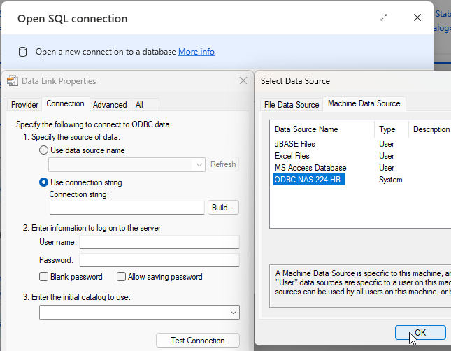 • Jetzt wählst du deine eingerichtete ODBC-Verbindung aus (z. B. „ODBC-NAS-224-HB“)