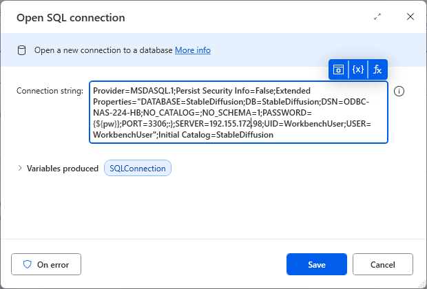 7. Bestätige alle Fenster mit OK – Power Automate Desktop schreibt dir jetzt automatisch den kompletten Connection String in das Feld