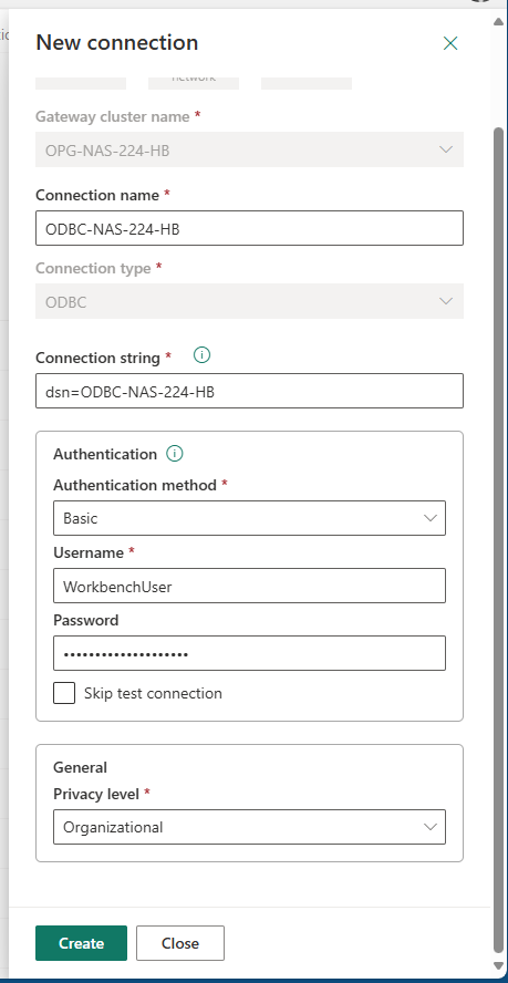 Als Authentifizierungsmethode wählst du Basic und gibst deinen MariaDB-Benutzernamen und das zugehörige Passwort ein. Optional kannst du noch den Datenschutzlevel setzen, z. B. „Organizational“. Mit einem Klick auf „Create“ wird die Verbindung angelegt und getestet. Sobald alles erfolgreich ist, steht dir die Connection für Datenmodelle und geplante Refreshes im Power BI Service zur Verfügung.