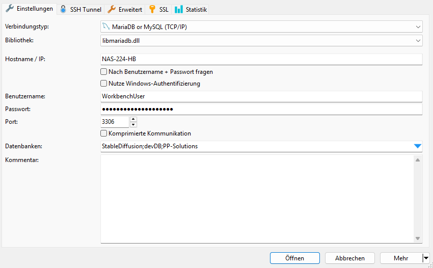 • Den Standard-Port 3306 musst du ggf. anpassen, je nachdem wie MariaDB auf deinem NAS konfiguriert ist.