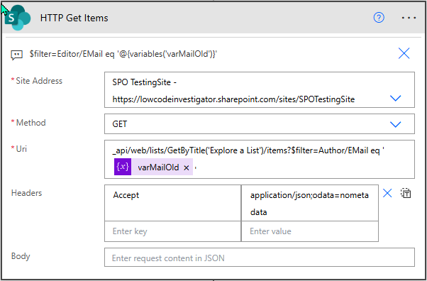 _api/web/lists/GetByTitle('Explore a List')/items?$filter=Author/EMail eq '@{variables('varMailOld')}'