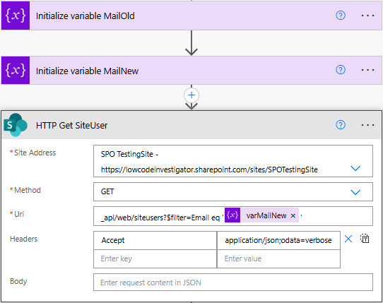 _api/web/siteusers?$filter=Email eq '@{variables('varMailNew')}'