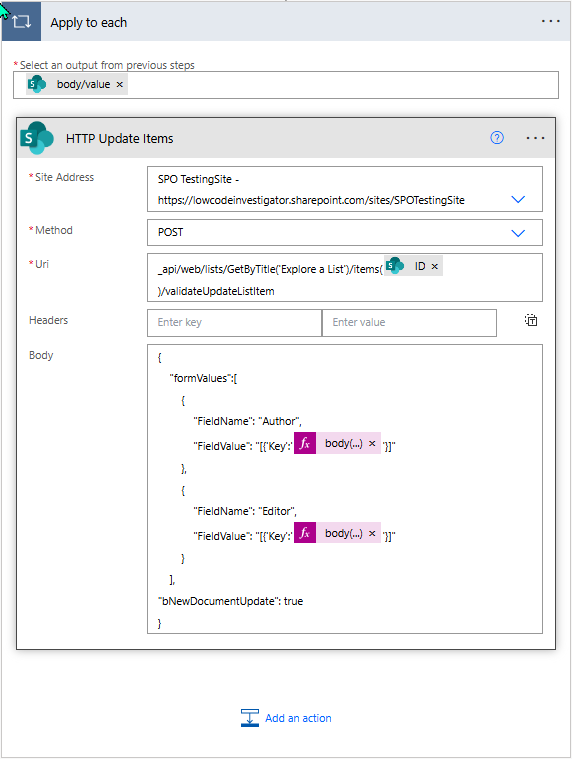 _api/web/lists/GetByTitle('Explore a List')/items(@{items('Apply_to_each')?['ID']})/validateUpdateListItem